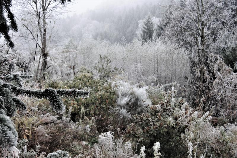 Ich habe hier leider mehr als genug Nebel, dadurch ist es ungemütlich nasskalt, und sowohl Gartenarbeit als auch Spaziergänge machen nur begrenzt Spaß. So eine Raureifwelt wie beim Lord habe ich hier schon eine ganze Weile nicht mehr gesehen. Ich werde am Montag noch ein letztes Mal im Baumarkt schauen, ob die Blumenzwiebeln nun reduziert wurden, da waren die Tage noch Massen vorhanden. Vermutlich werden sie die dann wieder für 1 EUR pro Packung verramschen, und ich verfluche die Tatsache, dass ich hier zur Zeit absolut keinen mehr Platz habe... Zeit für Gartenarbeit war heute sowieso nicht, als ich nach Hause kam, herrschte bereits so dichter Nebel, dass es schon anfing zu dämmern.
