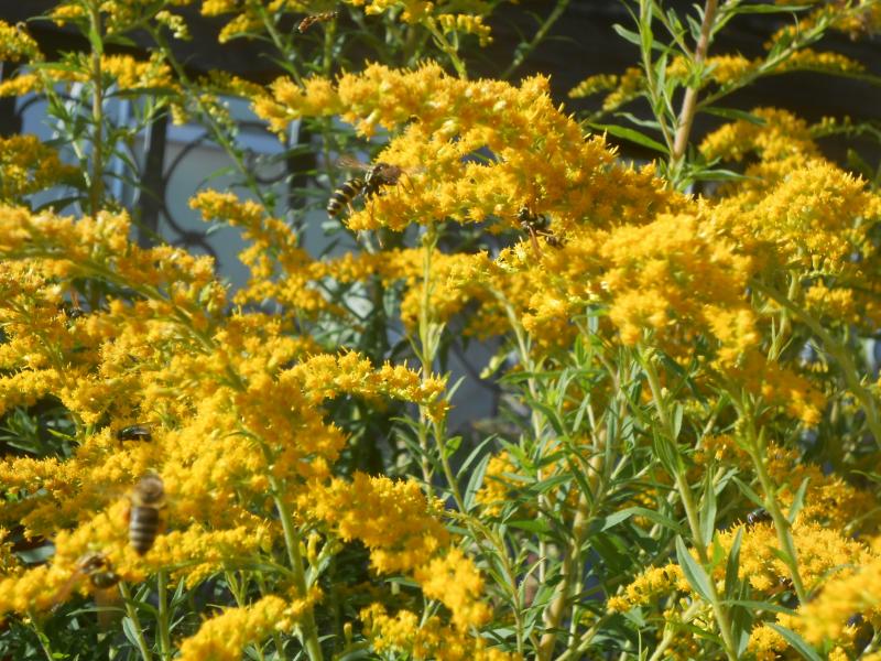 Bei uns haben es auf die Goldrute hauptsächlich Fliegen und Wespen abgesehen, aber auch Honigbienen. Wespen gibt es hinter unserem Haus jede Menge, da sind überall Nester.