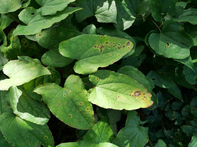 Dieses sommergrüne Epimedium zeigt seit 2 Wochen braune Blattflecken.In direkter Nachbarschaft stehen 3 weitere Epimedien, bislang völlig unauffällig.