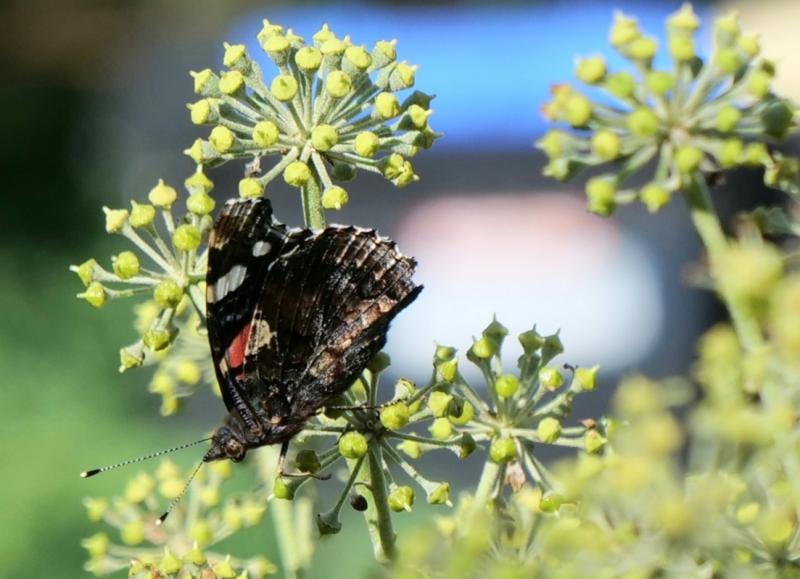 Nachdem in diesem Jahr ganz besonders wenige Schmetterlinge zu beobachten waren , tummeln sich jetzt zahlreiche Exemplare des Admirals an den Efeublüten. Hier konkurrieren sie mit Heerscharen von Honigbienen . Hässliches Foto von einem schönen Schmetterling ;)