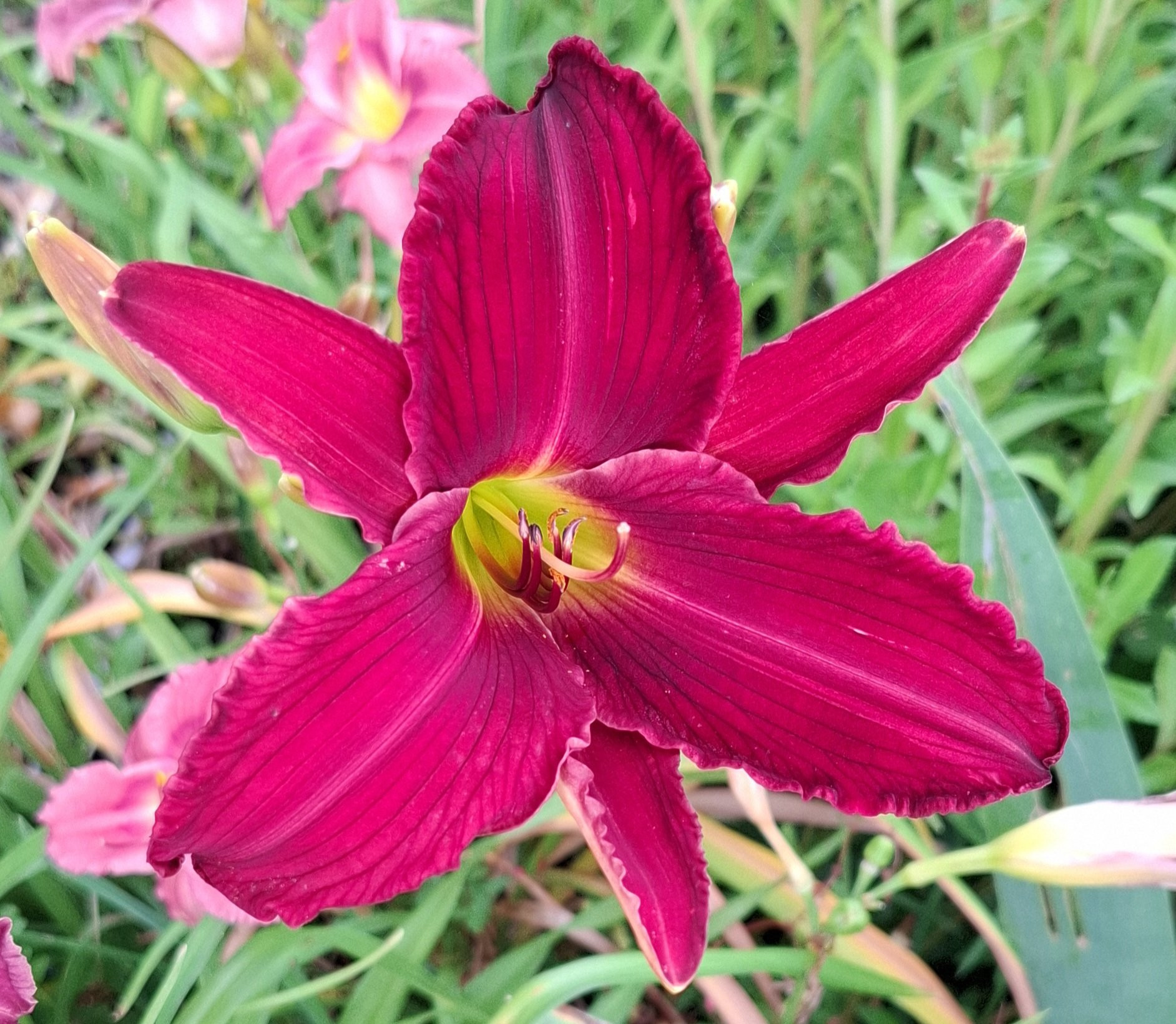 Gestern unterhielt ich mich mit Planthill darüber, dass die Taglilien heuer so kräftige Farben haben. Wie zum Beweis leuchtete mir heute früh 'Tiefrosa Zeiten' fast feurig entgegen (auf dem Foto leider etwas zu hell )