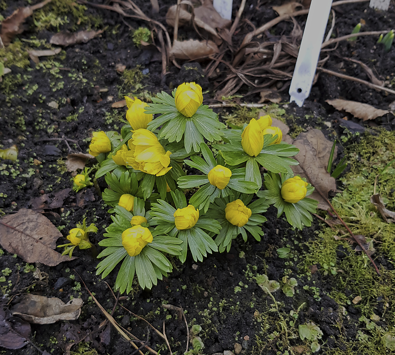 'Winterzauber' ist bei uns ungefähr genauso weit wie die normalen Winterlinge, die zwei Meter weiter stehen. Der Standort ist trotzdem verschieden, 'Winterzauber' steht nördlich am Stammfuß der großen Süßkirsche. Das kann schon einiges verzögern.
