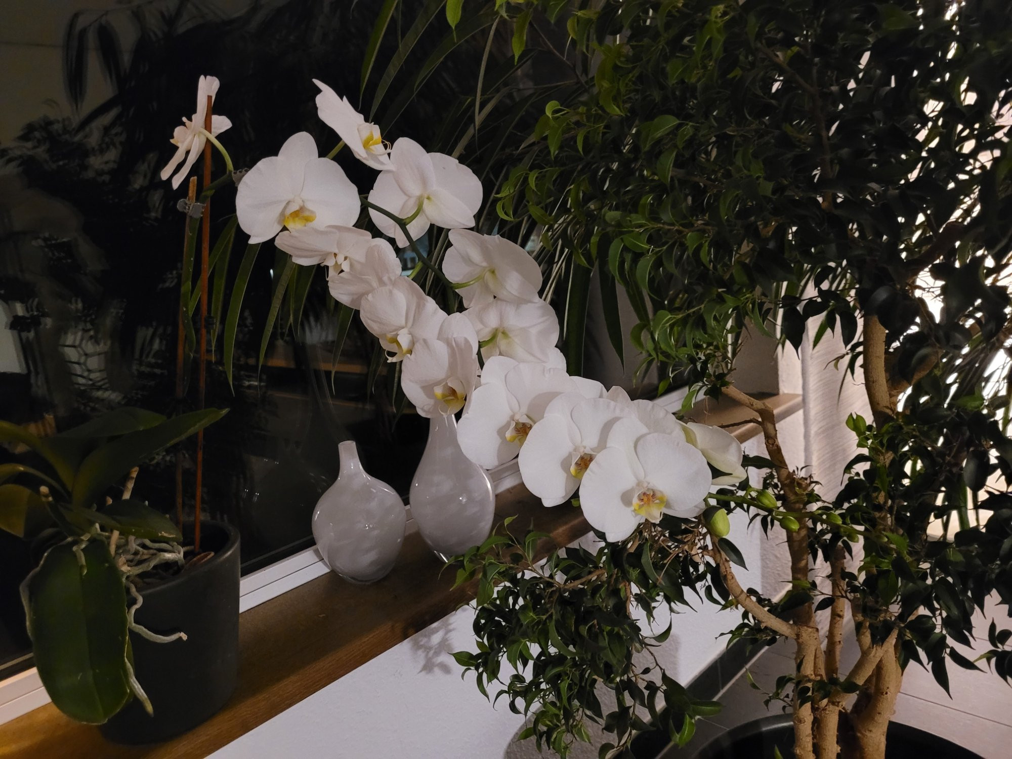 Weiße Phalaenopsis habe ich aber tatsächlich auch, vor 20 Jahren von einer ganz wunderbaren kleinen Gärtnerei abgeblüht als 'Zugabe' geschenkt bekommen. Sind inzwischen auch zwei große Töpfe, könnten allerdings noch größer sein, aber ich finde keine richtig großen transparenten Orchideentöpfe.