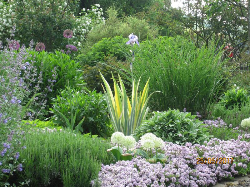 Ein schönes vom Mai zeige ich noch, rechts neben der Iris ist ein Hügelchen vom Anaphalis zu sehen, es sind mehrere in dem Beet. In diesem Sommer leiden sie sehr unter der Trockenheit und sind vergleichsweise mickrig.