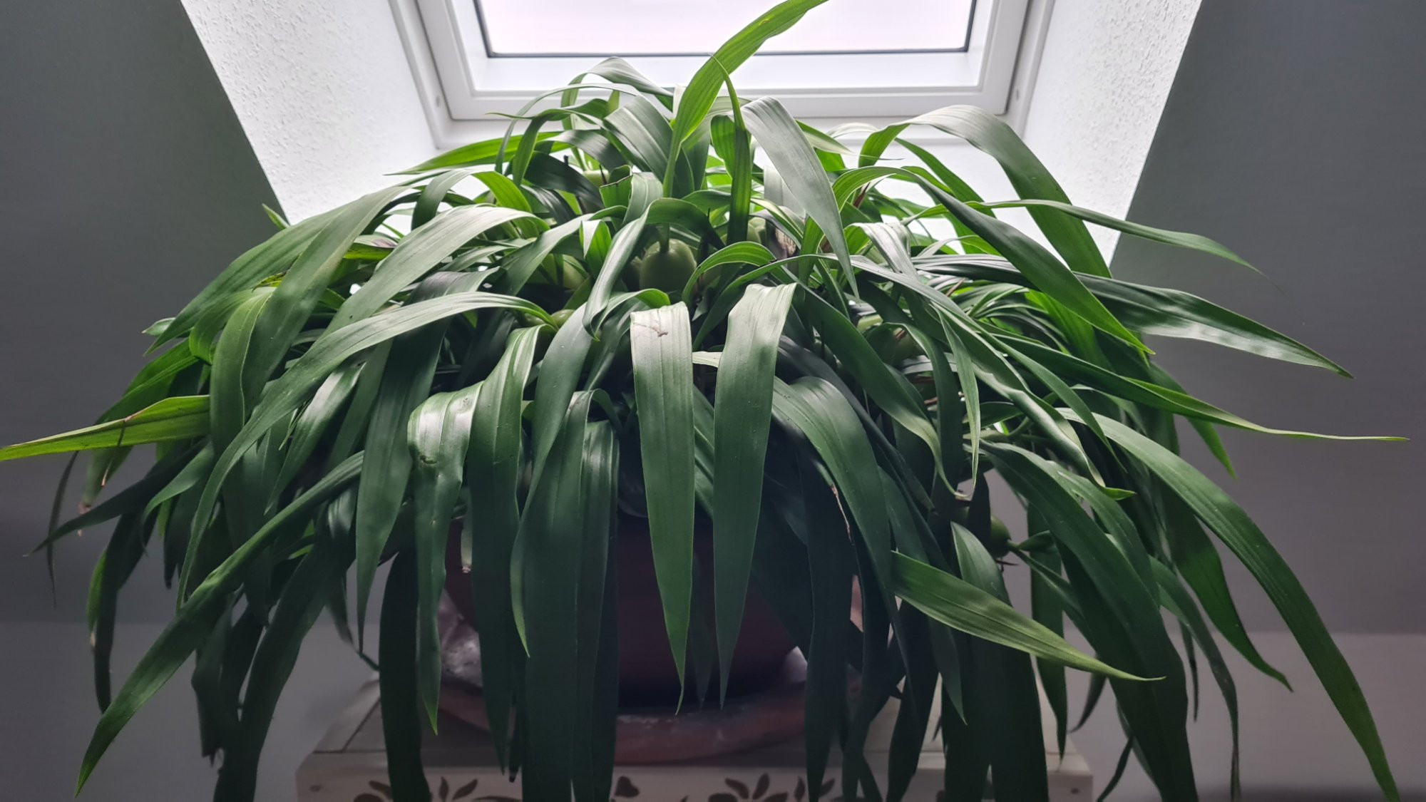 Die Coelogyne ist im Winterquartier angekommen. Auch wenn es auf dem Bild kaum danach aussieht: sie ist mit über 15 kg in der Rubrik Kübelpflanzen angekommen und wir haben sie zu zweit ins Dachgeschoss geschleppt.