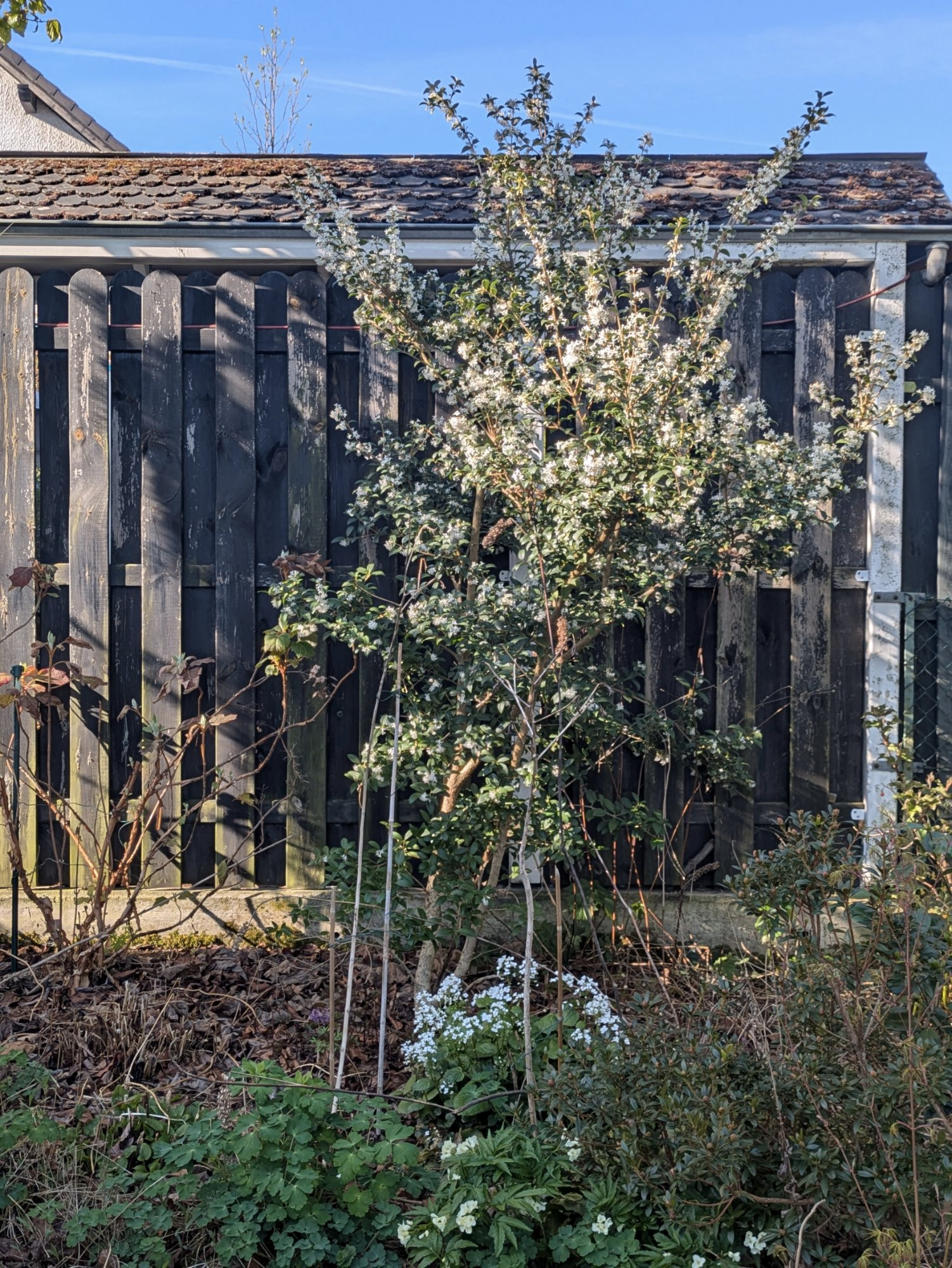 Mein Osmanthus delavayi bleibt wohl kleiner, das Laub ist im Vergleich auch sehr zierlich (vielleicht so groß wie der Fingernagel vom kleinen Finger), aber an Blütenreichtum und sicher auch Duft muss er sich nicht hinter seinem großen Bruder verstecken. Ich habe ihn im Topf, genauso wie Loropetalum chinense, beide erfreuen mich gerade sehr, da sie zur Vollblüte ansetzen. Für das Foto habe ich sie nebeneinander gestellt, ansonsten steht die Duftblüte jenseits des Wegs.
