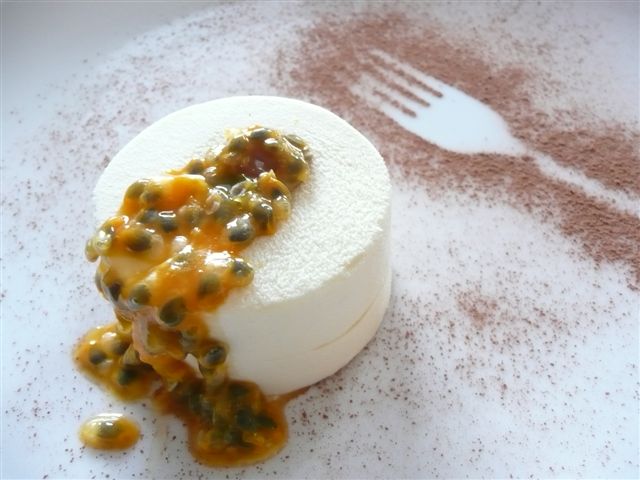 es gab:Karottenflan mit etwas BlattsalatKaninchen "sizilianische Art", Risotto Mandelmilch-Parfait mit Passionsfrucht