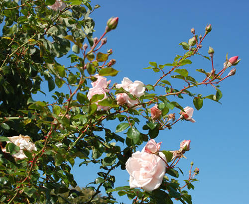 Die New Dawn wird demnächst wieder explodieren vor Blüten, herrlich der blaugrüne Blatthintergrund vom Judasbaum, vom Haus aus ein sehr schönes Bild - hell auf blaugrün:
