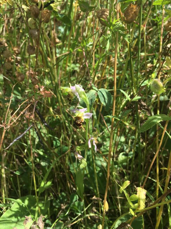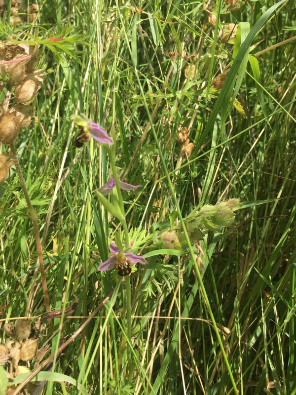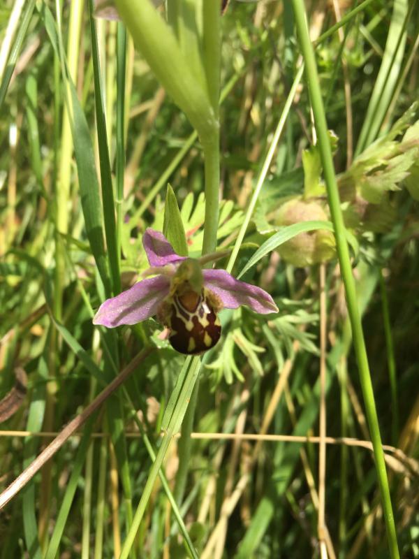 Trotz „Noch-Fettwiese“ tauchte 2013 eine blühende Ophrys apifera in meiner Wiese auf, der Samen dürfte aus dem 4-5km entfernten aufgelassenen Tagebau gestammt haben, dort gibt es Orchideen.