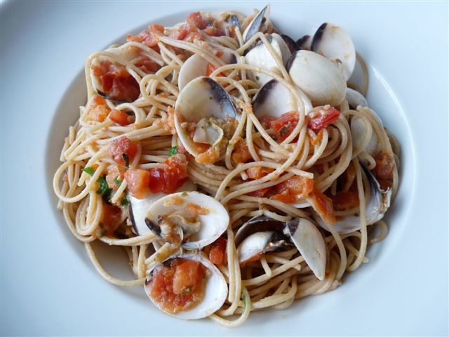 danach gabs spaghetti mit paprikapesto, cocktailtomaten und miesmuscheln