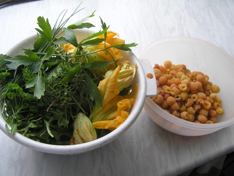 ich weiß, es wird langweilig, wenn ich jedes mal das gleiche zeige, aber ich hab halt freude an meiner ernte. deswegen wieder salat, kräuter, zucchiniblüten und ein pfund gelbe himbeeren.