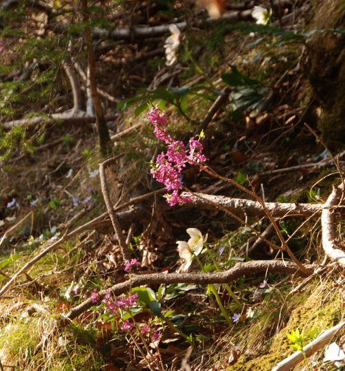 Und mit Daphne mezerum. Allerdings sieht man hier die Hepaticas nicht so. Ich habe auch die in meinem Empfinden sehr blauen Waldflächen fotografiert, aber das sieht auf den Bildern immer sehr mickrig aus.