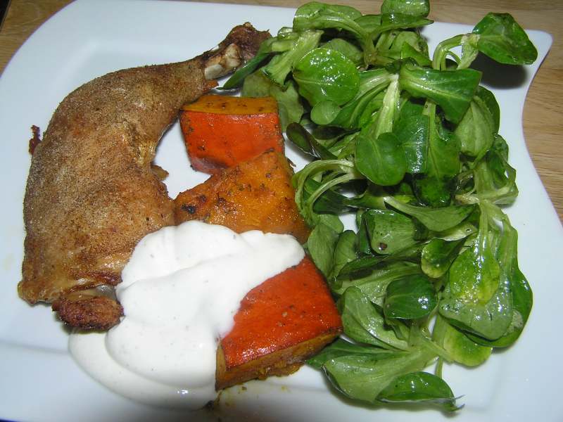 gestern gabs hähnchenschlegel mit ofenkürbis (der letzte, jetzt hab ich aber für die nächsten monate auch genug davon), ackersalat und zitronensauerrahm