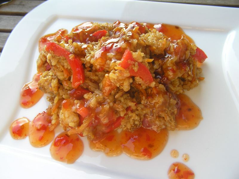 ) bratreis mit sesam und chilisoße. ich musste dringend noch gemüse verbrauchen...
