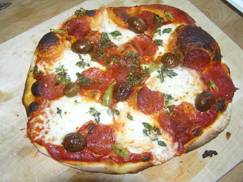 hier z.b. mit mozzarella, scharfer salami, oliven sowie pepperoni und basilikum aus dem garten mit schönen dicken blasen im teig.dazu gabs einen romanasalat mit kräutern - auch aus dem garten und rotwein