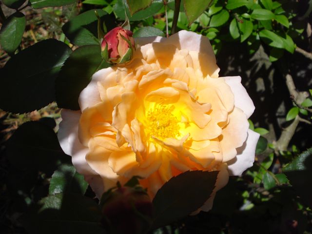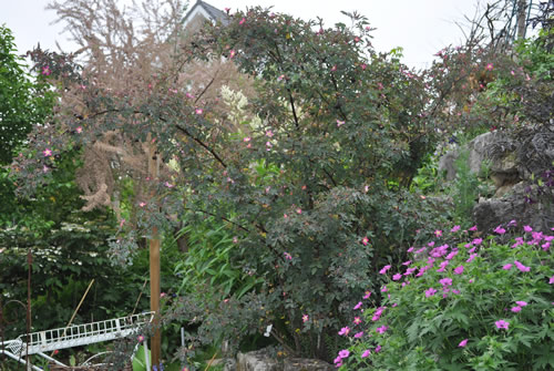 So Fyvie, jetzt habe ich die Glauca nochmals fotographiert. Jetzt seitlich, das Foto vorher war von oben.Die stösst also beidseitig an den Bildrand. Schneiden tu ich sie aber trotzdem, damit ich auf dem Weglein zwischen Teich und Rose hindurchkomme, das ist nur 40 cm breit. Vor allem unten schneid ich sie nach Innenauge.marcir, bei mir hat willi auch im zweiten Jahr dann richtig Triebe geschoben und heuer dann erst so richtig üppig Knospen angelegt, da kannst du dich bestimmt auf nächstes Jahr freuen, denn die Knospen sind dann mittlerweile auch so viele, dass der blöde Stecher nicht mehr so viel anrichtet! :-XZur Therese Bugnet kann ich dir nur beipflichten, sie wächst bei mir im Abstand von 40 cm (, der Platzmangel...) vor einer 3m hohen Thujenhecke und ist trotzdem ein üppig blühender großer Strauch, den ich nie zusätzlich gieße.Die Glauca hat bei dir so eine harmonische runde Form, schneidest du sie? Bei mir fällt sie etwas auseinander...