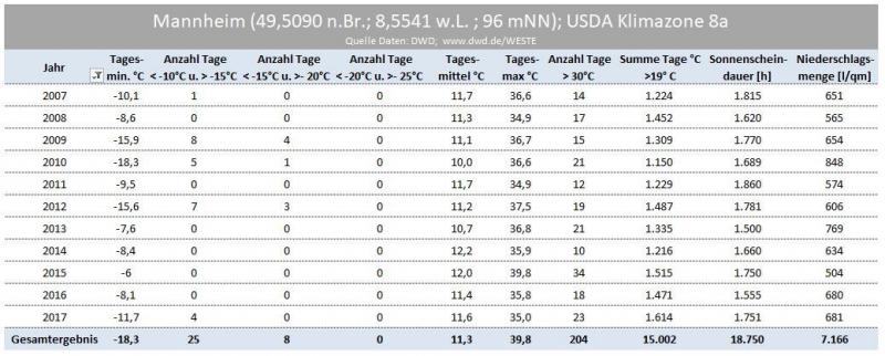 interessant sind die Werte zu Wien, da dort die ansässige Versuchsanstalt Granatäpfel selektiert und eine Sorte in die Vermarktung gebracht hat, die überlebt hat und regelmäßig gefruchtet hat, Mannheim als günstigster Standort in Deutschland kommt den Werten in Wien recht nahe