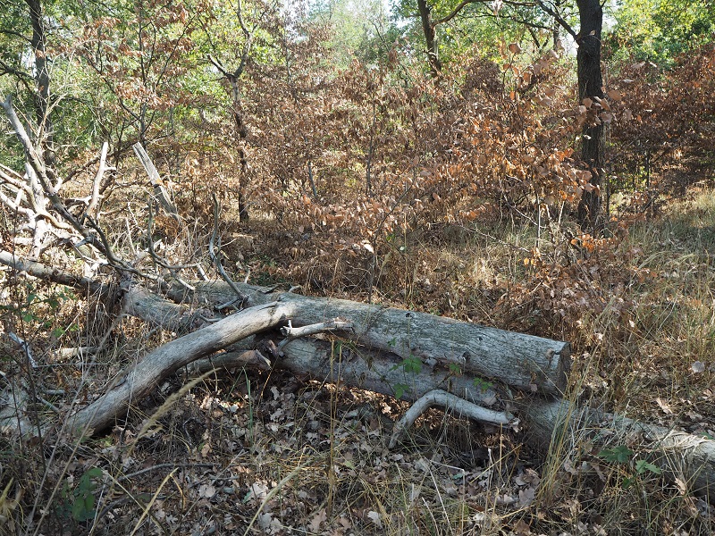 Üblicherweise stehen hier Kiefernwälder, die von einzelnen krumm gewachsenen Stieleichen durchsetzt sind. Vor mindestens 15 Jahren wurde an dieser Stelle mit Waldumbau begonnen und Buchen gepflanzt. Die Kiefern starben zum Teil 2018 ab, die Buchen sind in diesem Sommer zusammengetrocknet. Noch scheinen sie zu leben. Damit ein Feuer auch ordentlich Schaden machen kann, bleibt Restholz im Wald zurück.