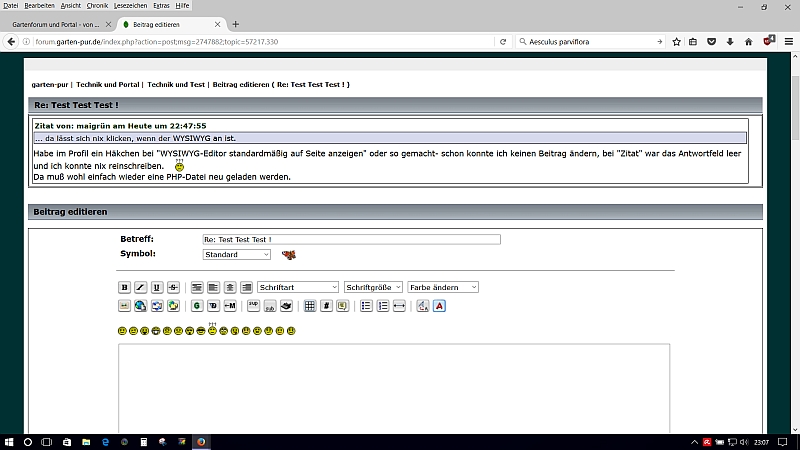 Leider klappt es immer noch nicht mit den Smileys, egal ob der WYSIWYG-Editor an oder aus ist.