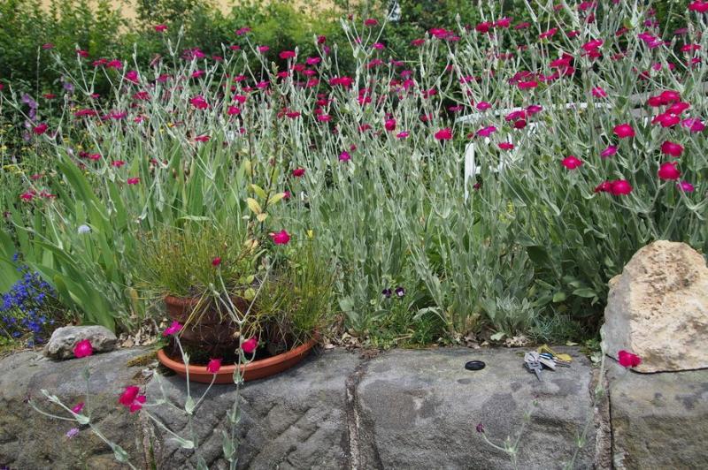 . Die Orlaya ist bei mir nicht gekommen. Muß ich nochmal aussähen.Meine Vexiernelken haben sich entschlossen endlich mal wirklich üppig zu blühen. Liegt es am Regen oder am Bor?Im Vordergrund auf der Mauer Drosophyllum lusitanicum fängt gerade mit dem zweiten Blütenflor an. Sieht genau wie Linum flavum aus.