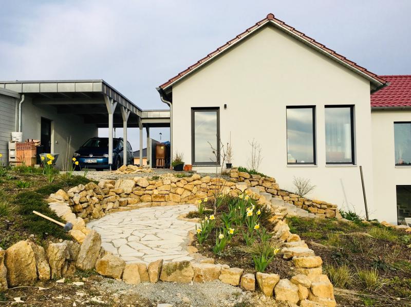... Mit viel freier Zeit gelang es in den letzten Tagen, die nördliche Ecke mit den Gemüsebeeten ordentlich zu Pflastern, natürlich mit den hiesigen Muschelkalksteinen. Es wurde wie auch sonst überall trocken in Kies verlegt, der noch ordentlich eingekehrt werden muss