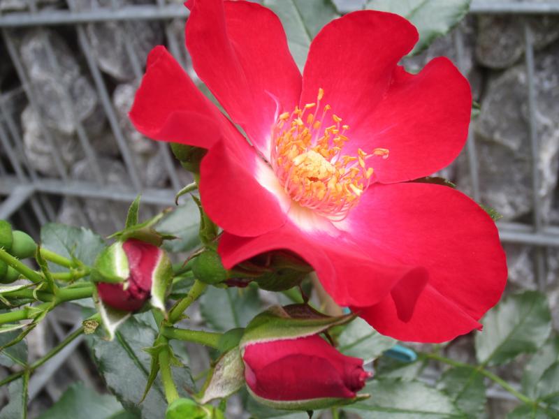 Meine im Frühling gepflanzte Kletterrose ist noch sehr mickrig, aber jetzt blüht sie und es ist wunschgemäß 'Dortmund'. :D