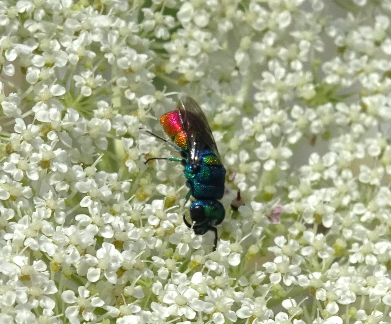 HIer mal was ganz metalicfarbenes. Vorsichtige Frage meinerseits: Goldwespe? Hab sowas noch nie gesehen bisher. (Zum Größenvergleich, das weiße ist eine Schafsgarbe).