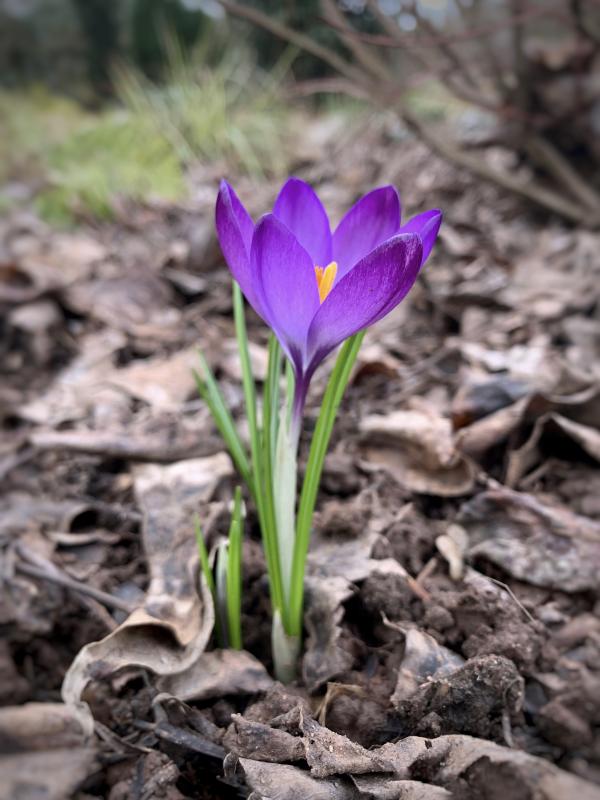 …und dieser hübsche „Einzelgänger“ muss sich als blinder Passagier in einer der Foren-Hostas befunden haben, denn lila Krokusse gab‘s hier bisher nicht. Crocus vernus vermutlich?