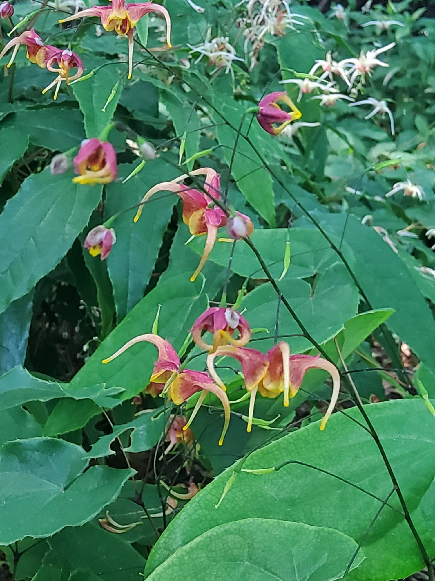 Pink Champage und Pink Elf, letzterer hat irgendwie niedliche Blüten, hoch über dem Laub.