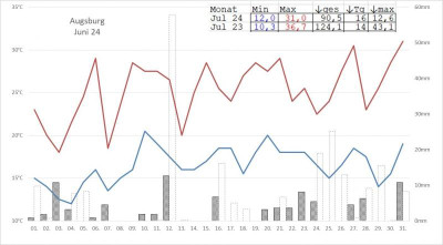 Mit 16,5°C war die Nacht längst nicht mehr so frisch wie die letzte, aktuell sind's bereits wieder 20°C, die 30°C-Marke wird heute noch einmal locker überschritten. Für morgen sind dann wieder Gewitter mit kräftigen Regenfällen angekündigt, die kommenden Tage bleiben wieder etwas kühler, aber da es nach dem Regen sicher wieder schwül wird, merkt man wohl kaum einen Unterschied.