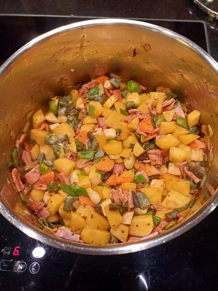 Hier gibt es heute auch Gemüseeintopf (Bohnen, Kartoffeln, Rosenkohl, Sellerie, Karotten, alles außer den Kartoffeln aus dem Garten) mit einem kleinen Stück magerem Kassler Braten.