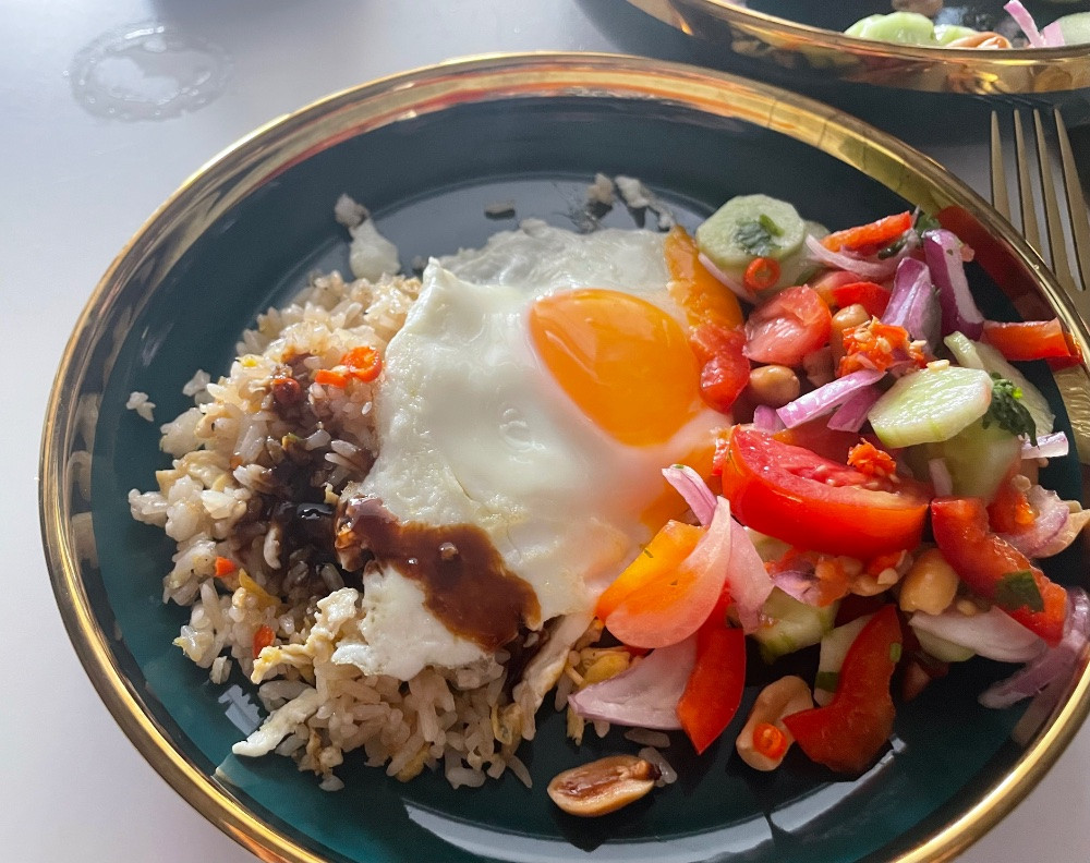 Heute gab es Reste vom Nasi goreng mit Spiegelei (Wir können hier kochen,) und einen Salat. Die Zutaten waren vom Markt: Tomaten, etwas Chili, Koriander, Gurken, rote Zwiebeln, gesalzene Erdnüsse und Limettensaft.