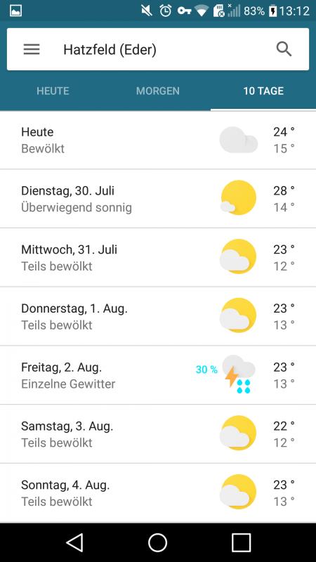 Nun machte ich wieder eins. Es sind nur 24 h vergangenen. (Ich weiß ein 10 Tage Trend ist nicht sehr vertrauenswürdig, aber ein 24-Stunden-Trend hinkt nicht viel besser hinter her). Selbst der heutige Tag stimmt nicht. Dort steht wolkig, ich guck aus dem Fenster und seh nur Sonne.