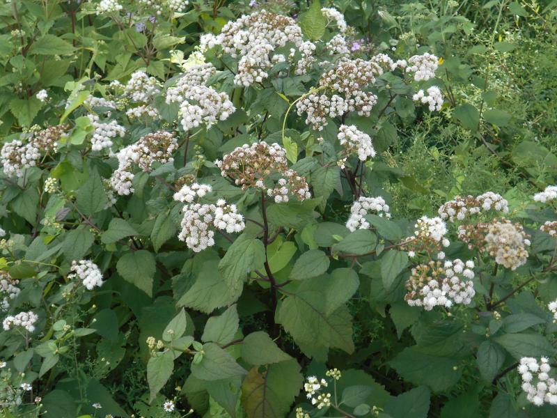 Ich tippe auf einen Eupatorium rugosum (Ageratina rugosa), vielleicht die Sorte 'Braunlaub', für 'Chocolate' erscheint sie mir zu hell.