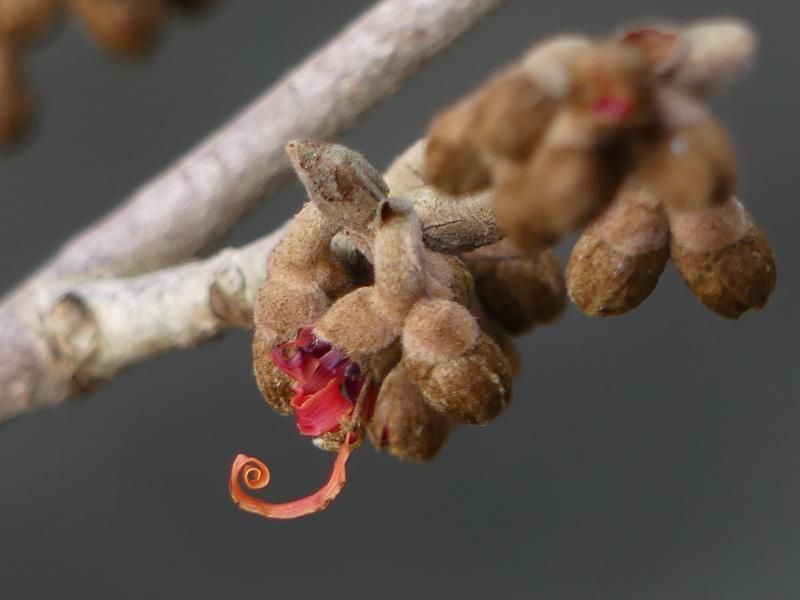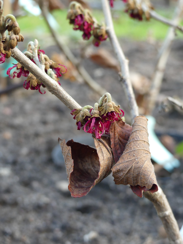 Die Hamamelis Washington Park, etwa zur gleichen Zeit gekauft, hat zwar Knospen, aber bei ihr tut sich noch nichts, zudem sind im unteren Bereich immer noch anhaftende vertrocknete Blätter, das ist blöd und sieht auch so aus... Die Amethyst hingegen ist schon relaiv lange komplett nackt, aber auch da tut sich noch nix. Die schwächelt bei mir irgendwie seit Jahren.