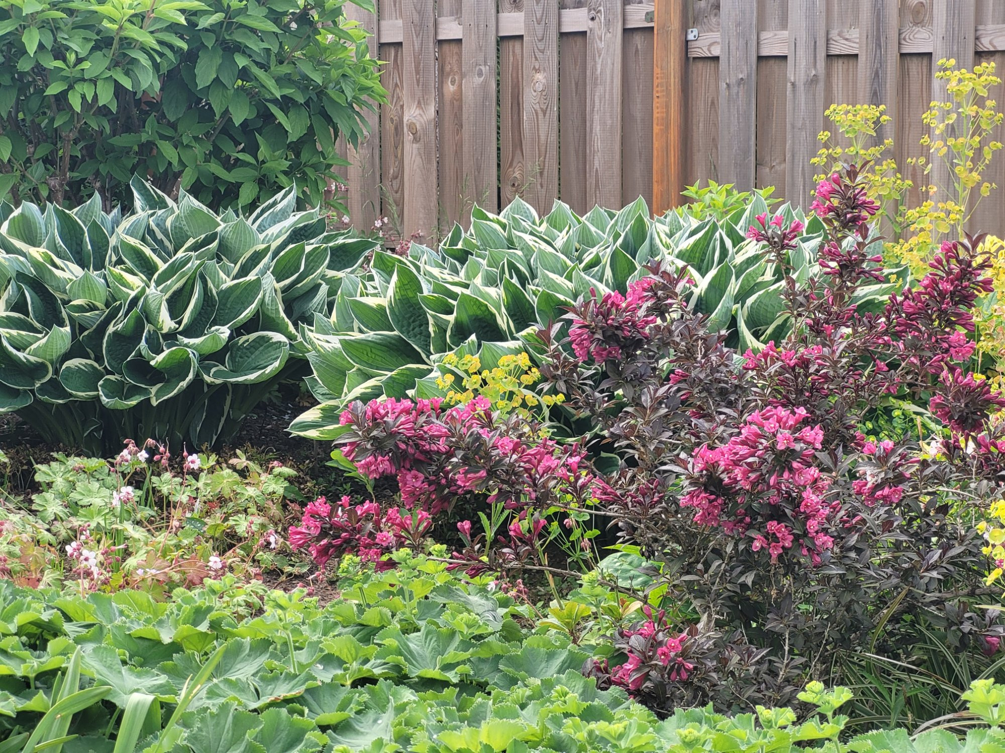 Es blüht nun diese kleine, dunkellaubige Weigelie vor dem V. Mariesii... in ca. 9 Jahren vielleicht 1m hoch gewordenen und sicher nichts Besonderes. Trotzdem hübsch... wie ich finde.