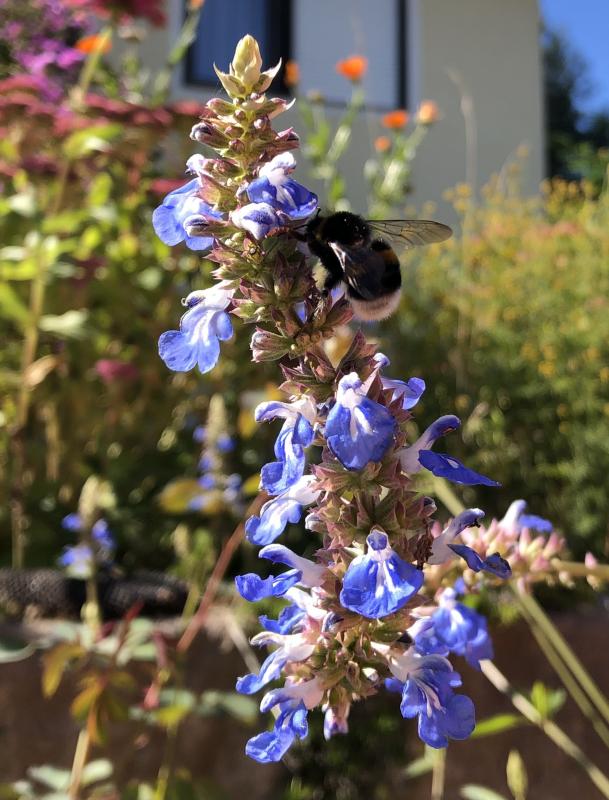 Die Salvia uliginosa heißt wirklich zu Recht mit Trivialnamen "Hummelschaukel ".Es zaubert wirklich jedes Mal ein Grinsen ins Gesicht, wenn die Bomber Hummeln nach dem Anflug mit dem gesamtem Blütenstängel hin- und herschwingen 🥰