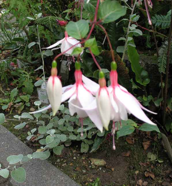 ... ihr zu Füßen, eine der schönsten winterharten Fuchsien - F. magellanica 'Versicolor'. Vom Austrieb im Mai bis zu den ersten stärkeren Frösten immer ein specktakulärer Anblick. Der Austrieb ist rosa in das sich später dunkelgrün mischt überlagert von einer silbrigen Patina die sich bei einem sonnigeren Standort noch verstärkt!