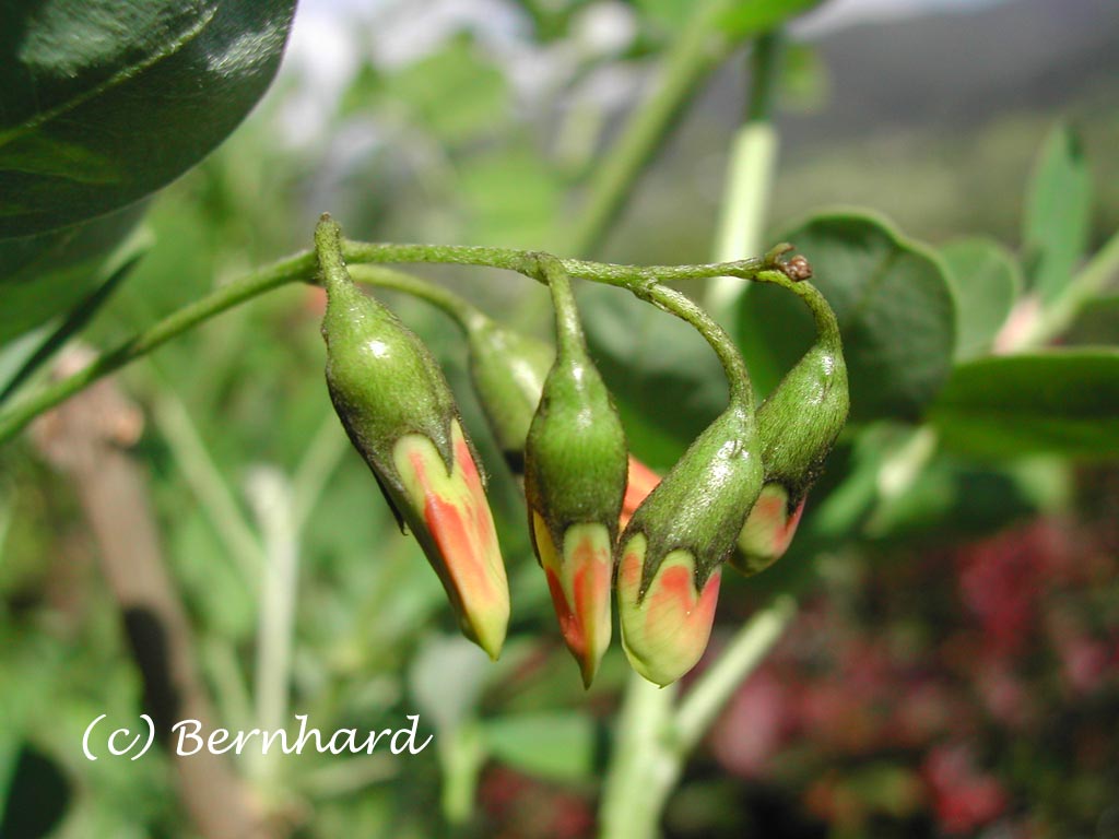der blasenstrauch, ein wunderbares wildgehölz in europas wärmeren lagen.hier die blütenknospen, die wirken, als seien sie mit einer festen hochglanzlasur eingelassen worden.