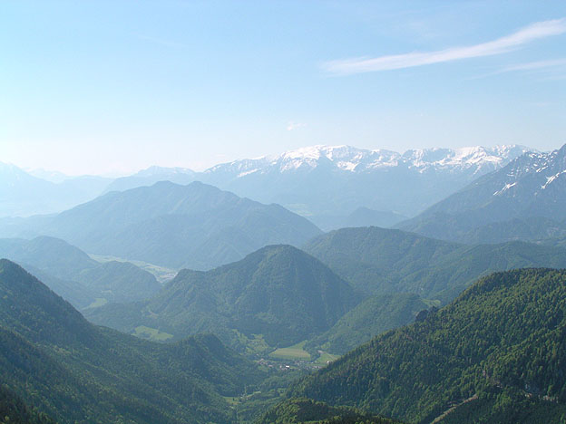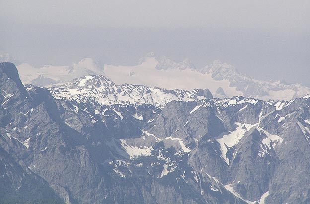 Hier nach Westen der Dachstein, es ist der schemenhafte, vergletscherte Gebirgszug hinter der ersten Kette.
