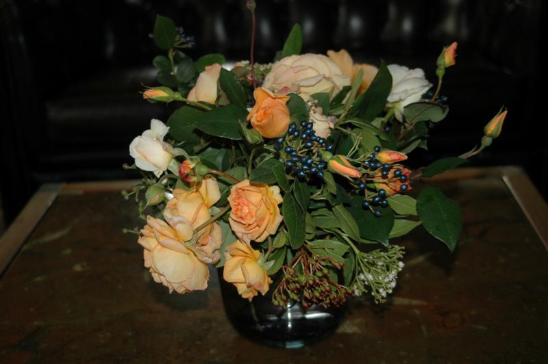 Die letzten Blüten von Abraham Darby' ( den ich am Rosenbogen entblättert und kahlgeschnitten habe, weil ich Rost auf der Blattunterseite entdeckte. 'Helena Renaissanse'( cremé, bisschen rosa) und 'Missis Oakly Fisher' ( die ungefüllte Blüte). Das ganze Wohnzimmer duftet!