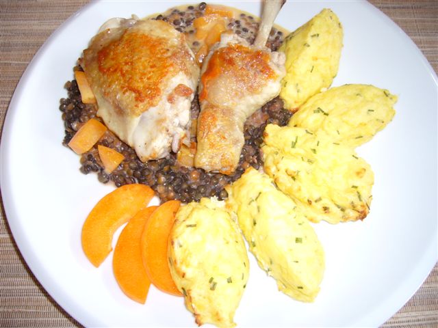 bei mir gab es:gebratenes Poulet auf Linsen mit Aprikosen ( die letzten aus dem Tiefkühler