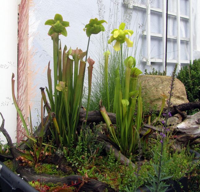 Die vier Schlauchpflanzen und zwei Venusfliegenfallen haben den Winter erstaunlich gut überstanden. Der Sonnentau leider nicht. Die Pflanzen stehen in zwei Schalen mit MoorbeetErde im Wohnzimmer und werden (meist) mit Regenwasser gegossen. - Inzwischen weiß ich auch, dass sie im Sommer besser draußen stünden...