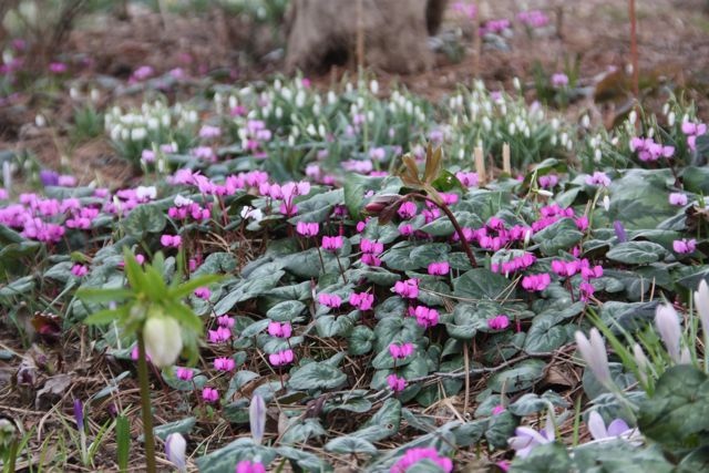 Besonders schön finde ich die Kombi der Cyclamen mit Ophiopogon.Der Kahlfrost in den letzten 2 Wochen hat meine Cyclanen ganz schön geplättet. Sie sehen jämmerlich aus. Die Schneeglöckchenblüten hängen am Bogen. Die Krokusse sind so schlau, erst 1-2cm aus dem Boden zu spitzen. Die mandelblättrige Wolfsmilch ist von Frost angeknickt. (also keine Blüten)