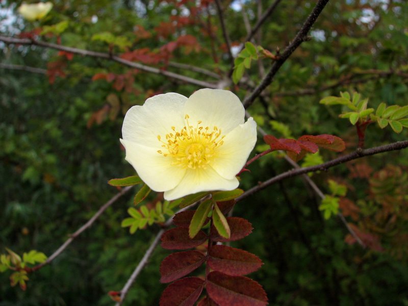 Dieses Jahr ist verrückt ...............Heute fand ich an meiner als R. cantabrigiensis nachbestimmten Rose (als R. primula gekauft) mehrere offene Blüten. Wohlgemerkt - die cantabrigiensis blüht beinah genauso früh wie die primula ......... und auch nur einmal. Eigentlich...........Dafür hat sie dieses Jahr nicht eine einzige Hagebutte.Aber hübsch - der ungewöhnliche Kontrast von Herbstlaub und Blüte.