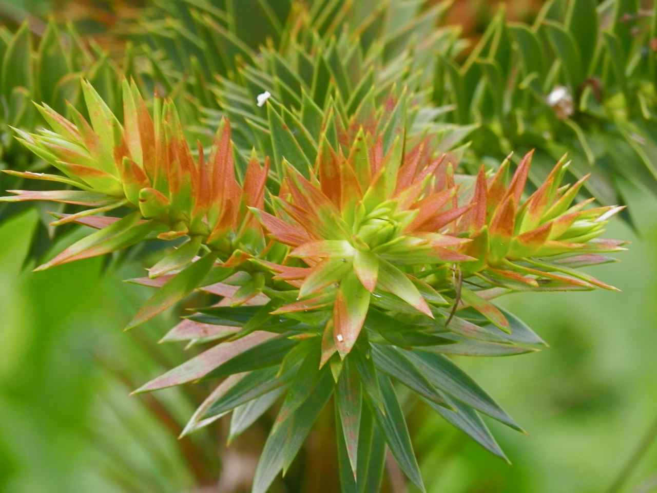 Die vom Frost braun gewordenen Araukarien-Triebe werden an den Spitzen wieder grün: