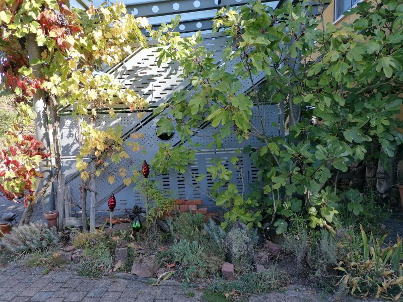 Der wärmste Gartenbereich. Übergang Hof zum Haus, Südwestseite. Momentan (morgens) noch Streuschatten durch großen Baum.