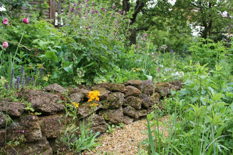 auf der anderen Gartenseite führt ein Weg ins Nirgendwo...den Goldlack habe ich nie gepflanzt, aber er hält sich seit Jahren. Ansonsten eher dezent alles.