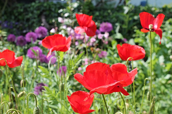 dieser Mohn kommt bei mir auch überall auf, es ist nicht Papver rhoeas, oder? Farblich passt der auch zu allem und ganz besonders exotisch zu violettem Allium!Kontrastprogramm in rot, Mohn.