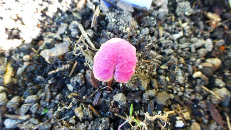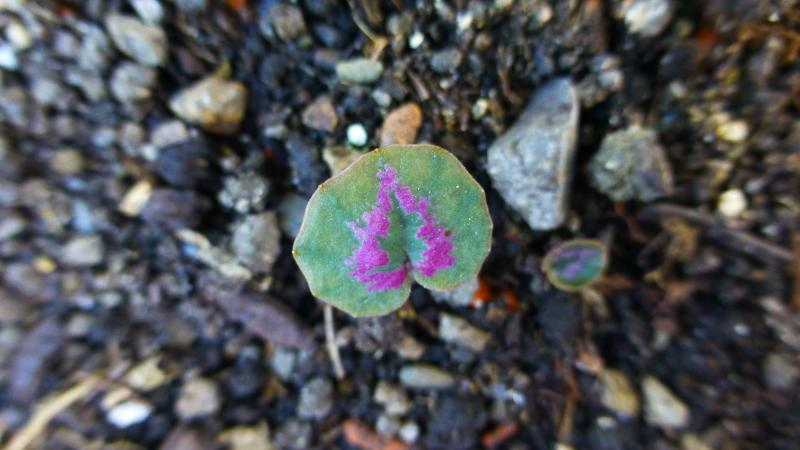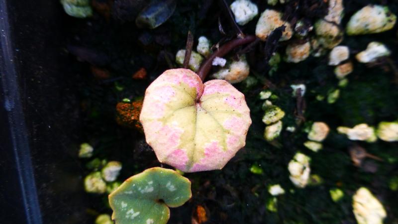 Ein Sämling von Cyclamen mirabile ´Tilebarn Nicholas´ zeigt sich so. Schön wäre es wenn die Färbung so bliebe. Ich denke aber das wird sich noch ändern.